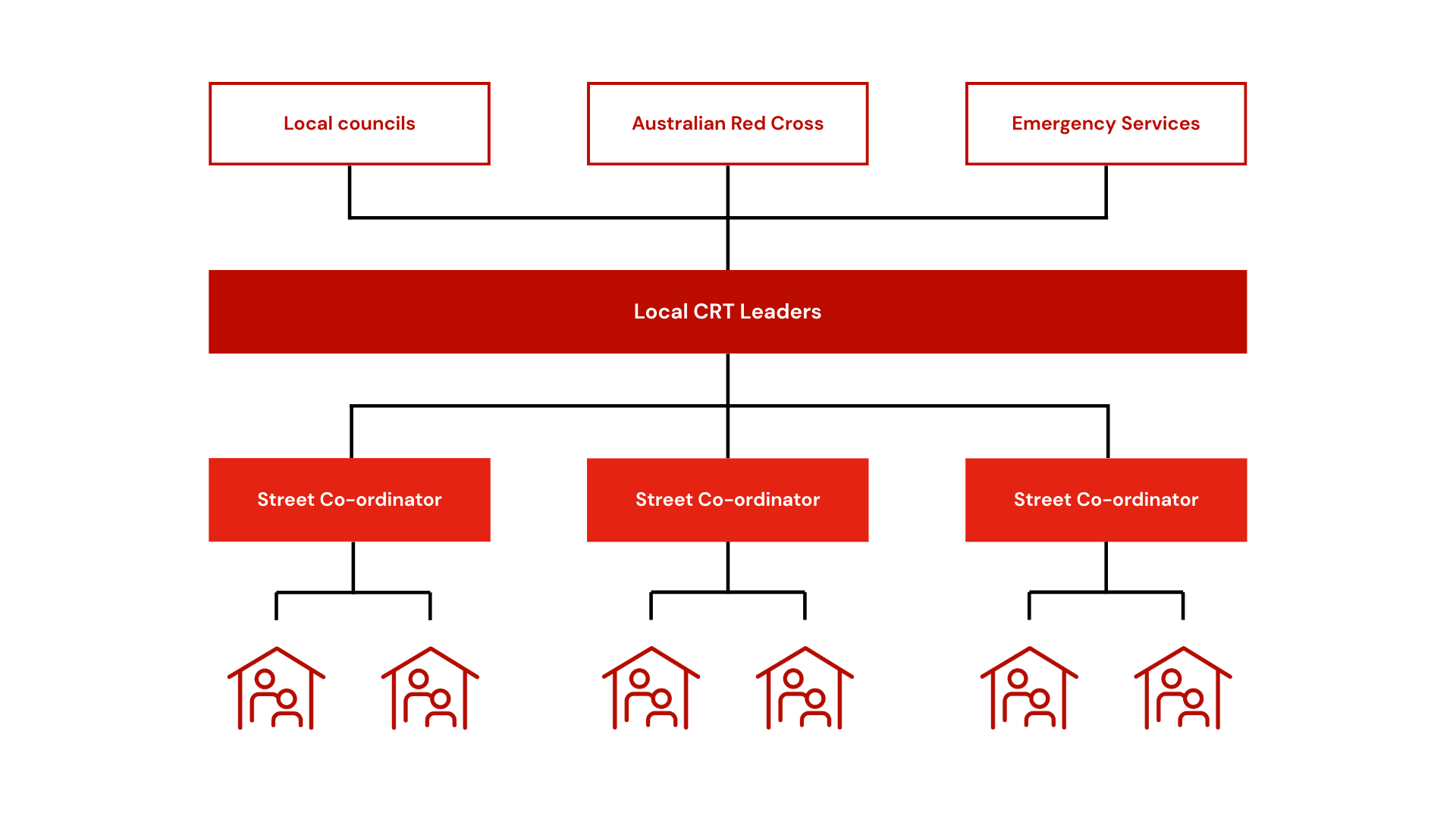 With the support of Australian Red Cross facilitators, CRT leaders establish a local network that can be activated around an emergency. This network allows information from local councils, emergency services and Australian Red Cross to be shared quickly and easily with households.