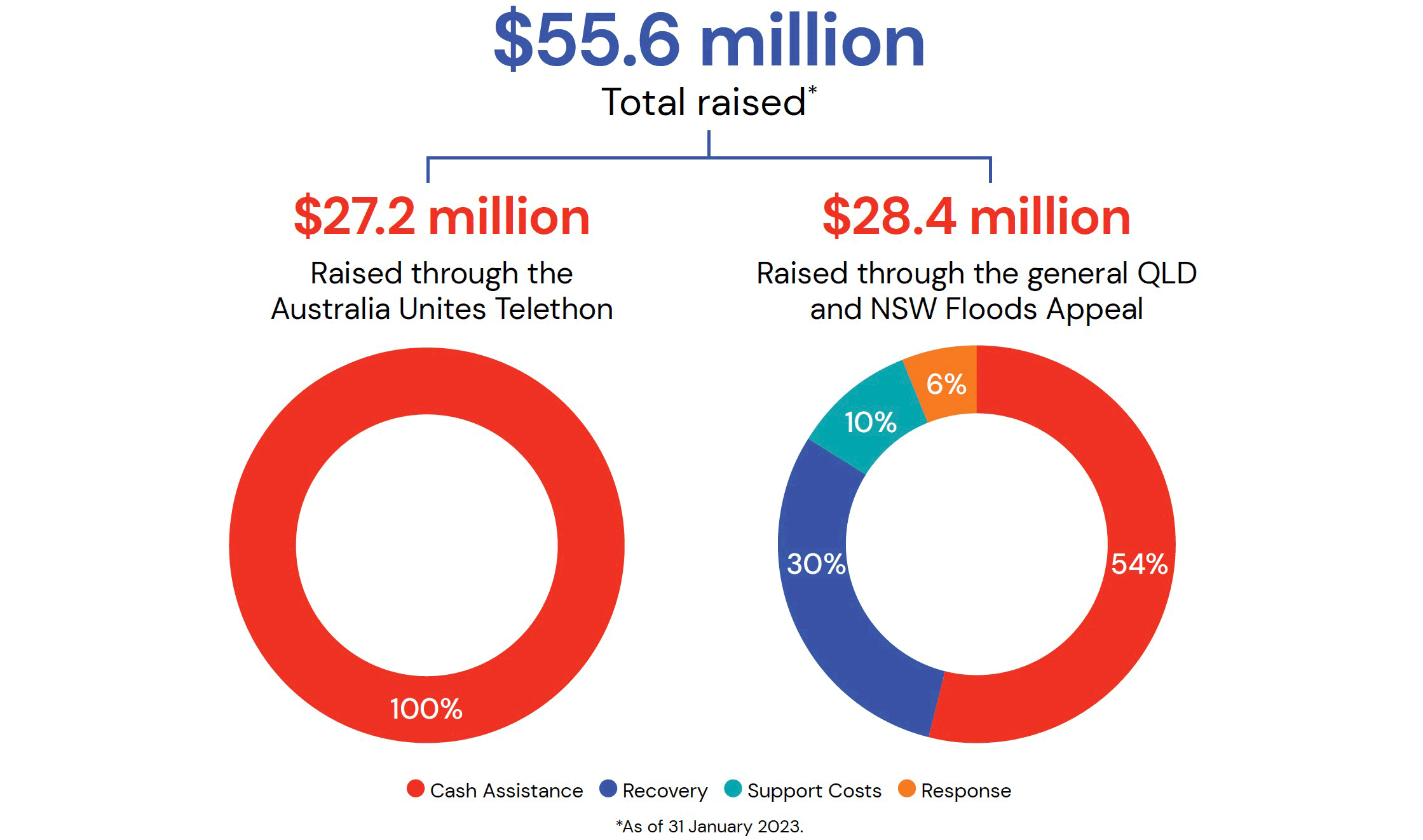 In the aftermath of the Queensland and New South Wales floods, as well as responding on the ground, in local communities, Australian Red Cross launched the Australia Unites Telethon and the Qld and NSW Floods Appeal to raise funds for impacted communities. Australia responded: individuals and communities, businesses, government agencies, and media outlets, including Channel 7, Channel 9 and Channel 10, came together to raise an incredible $55.6 million that provided immediate financial relief and is now supporting long-term flood recovery efforts.